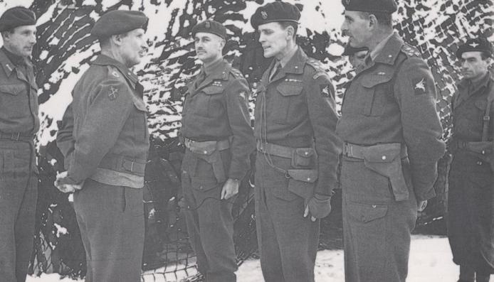English: Brigadier Poett talking with Field Marshal Montgomery during the Battle of the Bulge in January 1945. Left to right: Major-General Eric Bols (CO 6th Airborne Division), Field Marshal Bernard Montgomery, Brigadiers Edwin Flavell (6th Airlanding Brigade), James Hill (3rd Parachute Brigade), Nigel Poett, and Lieutenant-Colonel Napier Crookenden (CO 9th Parachute Battalion). |