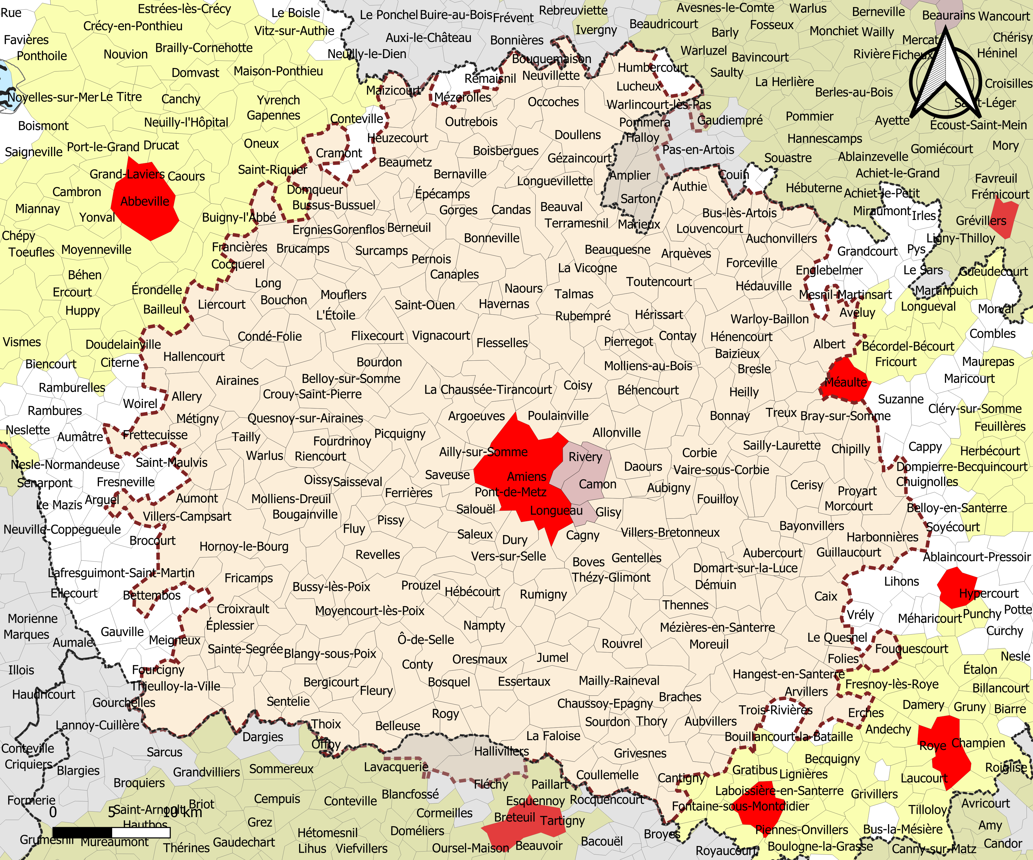 Français : Carte de l'aire d'attraction d'Amiensdans le département de la Somme (France). Zonage 2020 - Découpage communal au 1er janvier 2020. |