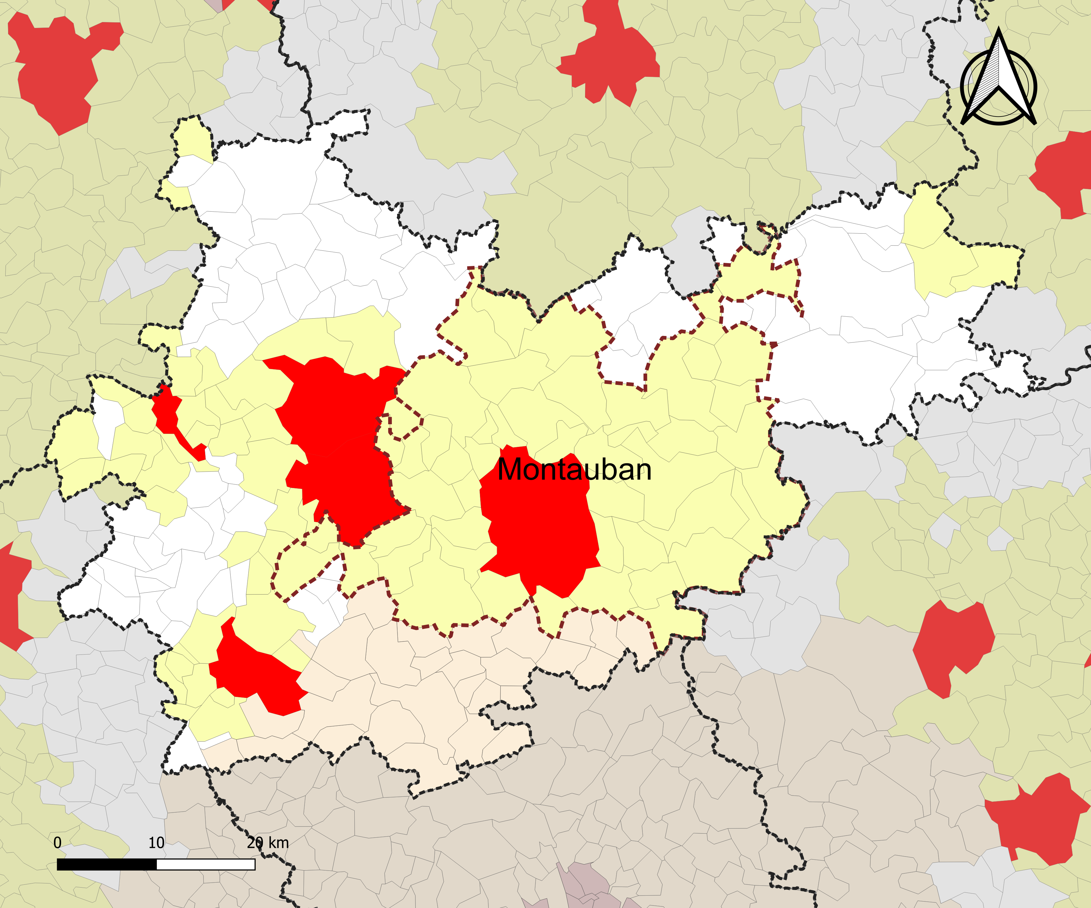 Français : Carte des aires d'attraction des villes 2020 dans le département du Tarn-et-Garonne (France). Mise en exergue de l'aire d'attraction de Montauban. Découpage communal au 1er janvier 2020. |