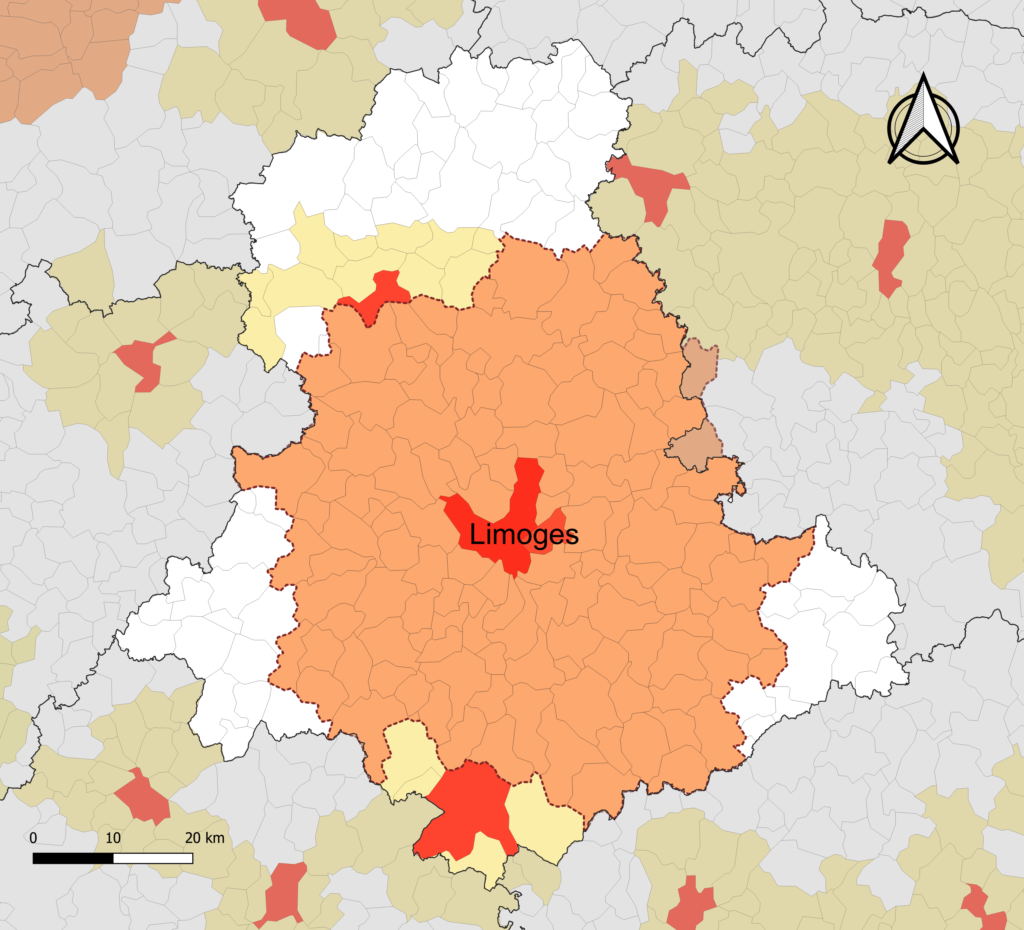 Français : Carte des aires d'attraction des villes 2020 dans le département de la Haute-Vienne (France). Mise en exergue de l'aire d'attraction de Limoges. Découpage communal au 1er janvier 2020. |