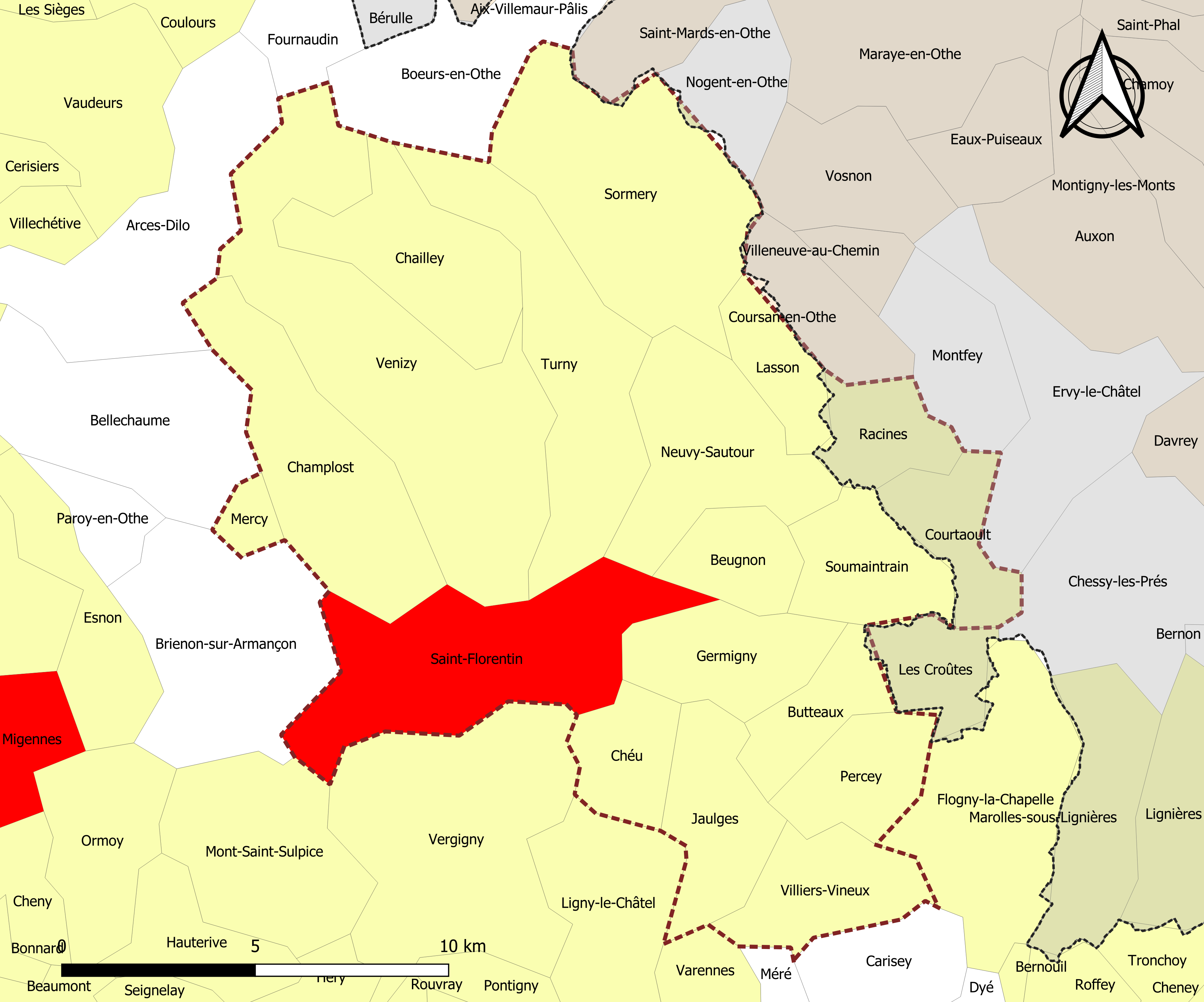 Français : Carte de l'aire d'attraction de Saint-Florentin dans le département de l'Yonne (France). Zonage 2020 - Découpage communal au 1er janvier 2020. |