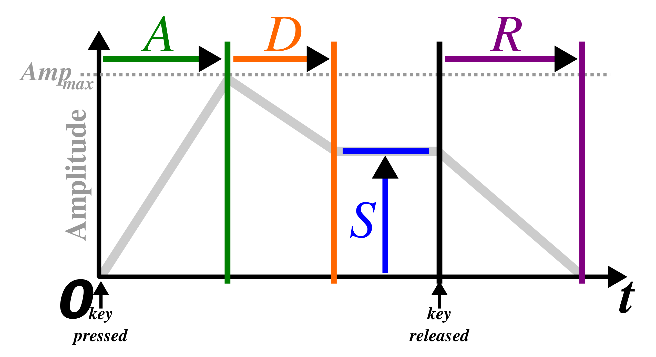 Image of how the four parameters A, D, S and R change the shape of an ADSR envelope.