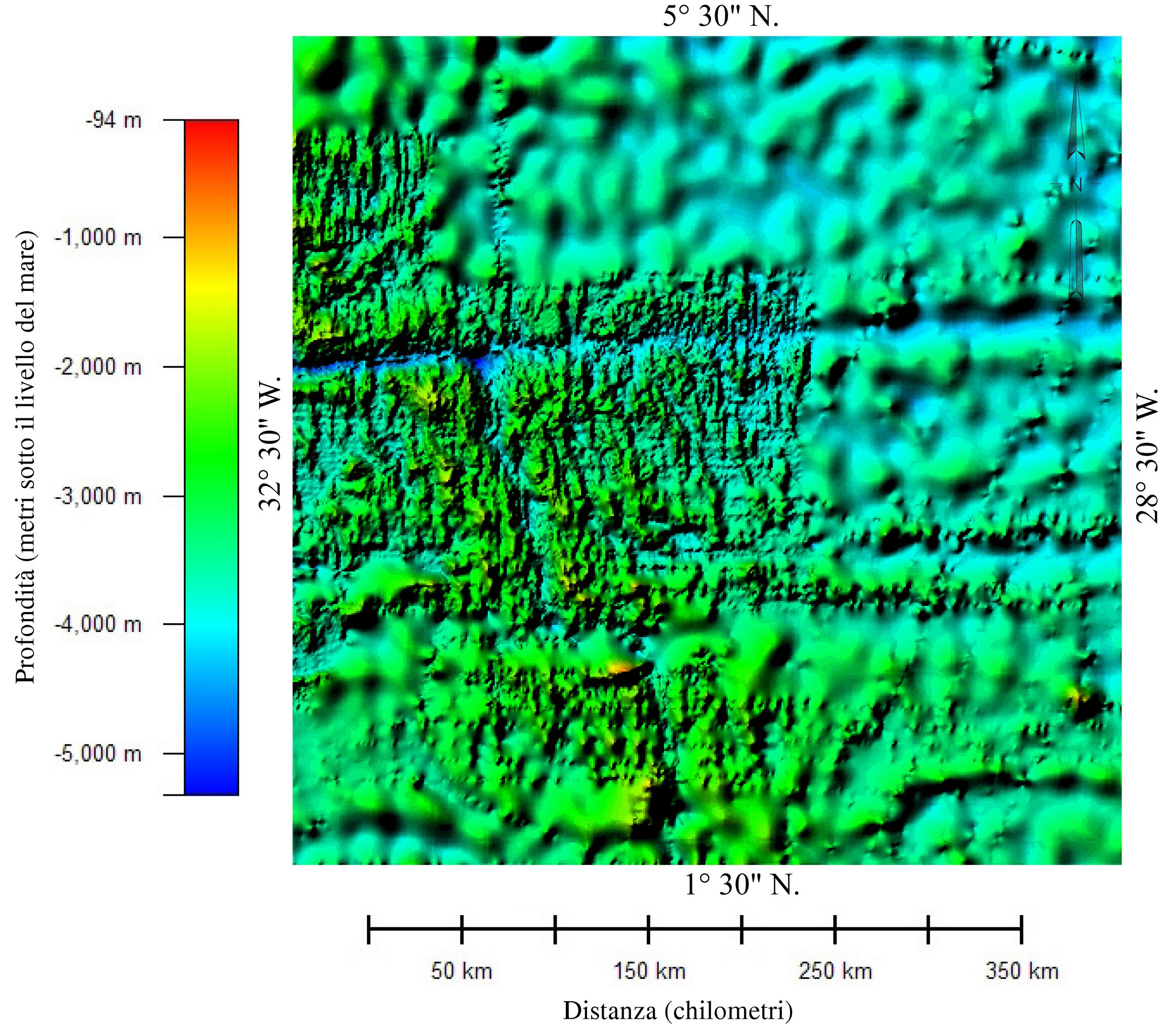 English: Color relief map of the bathymetry of the part of Atlantic Ocean in which Air France Flight 447 crashed. The image shows two different data sets with different resolution. The areas showing detailed bathymetry were mapped using multibeam bathmetry sonar. The areas showing very generalized bathmetry were mapped using high-density satellite altimetry. |