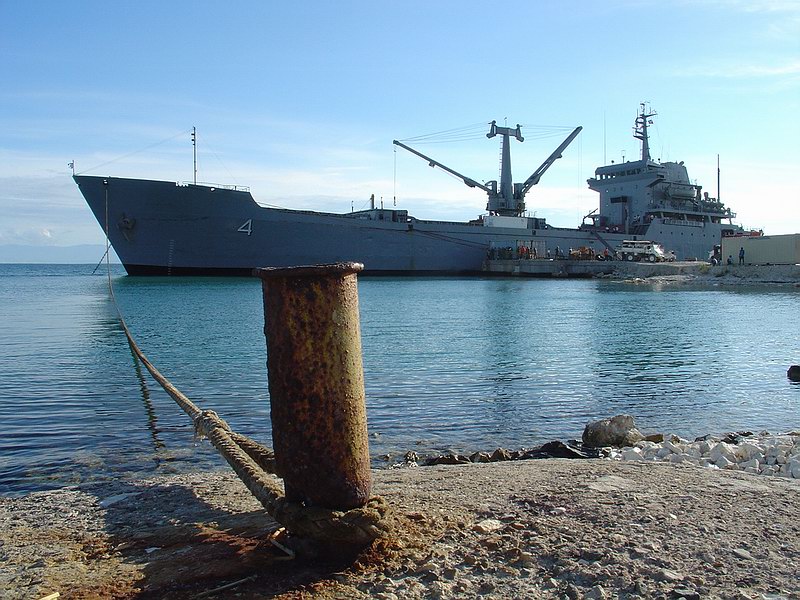 Español: El Transporte A.R.A. "BAHÍA SAN BLAS" descargando ayuda humanitaria argentina en su única entrada al Puerto Privado de Gonaïves el 22 de noviembre de 2005. Es una foto similar, pero aquí esta vista desde otra perspectiva, a la que se publicara por una contribución que efectué, con mis correspondientes derechos, en el siguiente link: http://www.histarmar.com.ar/Armada%20Argentina/TransportesNavales/Fotos/BahiaSanBlas1.jpg |