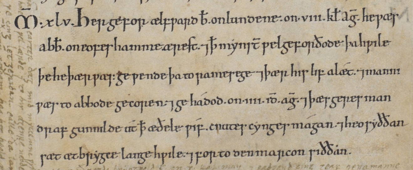 Français : L'annale pour 1045 dans le manuscrit D de la Chronique anglo-saxonne (MS Cotton MS Tiberius B IV, f. 71r). |