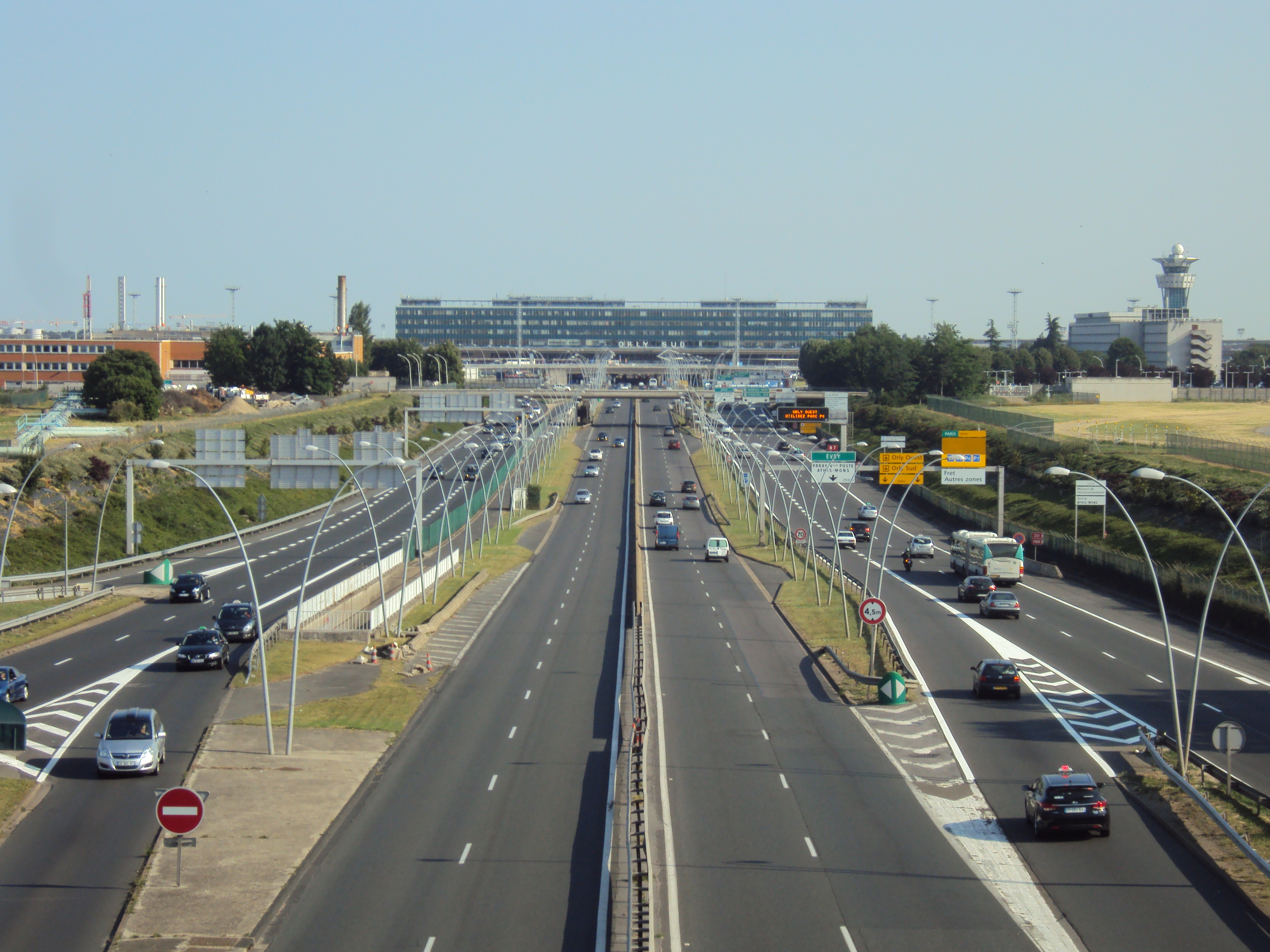 Français : L'autoroute A106 (voies extérieures) et l'ex N7 au nord de l'aéroport d'Orly. A l'arrière plan on aperçoit l'aérogare d'Orly Sud |