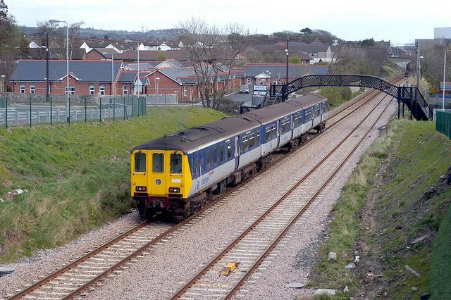 English: A Passing train 450 Class #8459 passes the site of Barn Halt station at 13:43pm on its journey from Belfast to Larne Harbour. The bungalows to the left of the photo are known as Barn Halt Cottages, and have been constructed within the last couple of years. |
