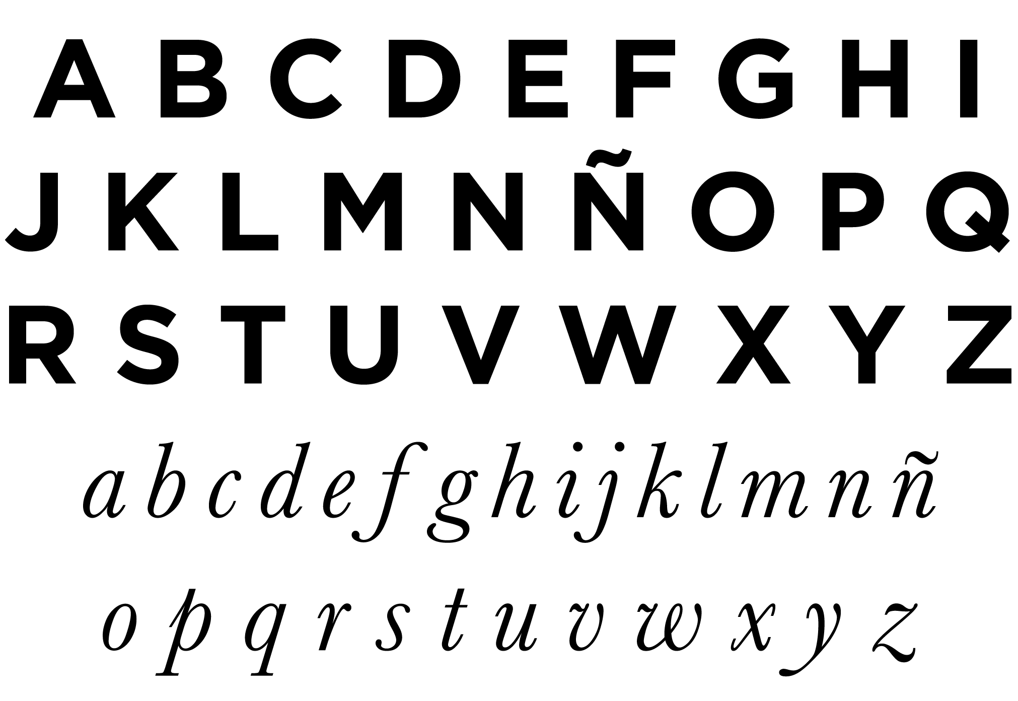 English: The 27 letters of the Spanish alphabet, in uppercase and lowercase cursive. Typefaces: Gotham, Baskerville.