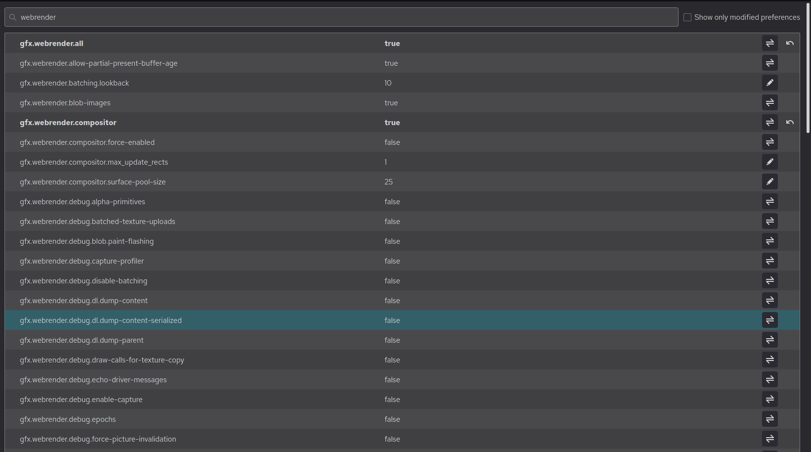 English: Screenshot of about:config in Firefox 92