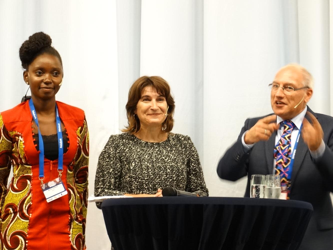 English: Marina Diboma (Netherlands African Business Council NABC), Lilianne Ploumen (Dutch Ministry of Foreign Affairs) and Ton Dietz (African Studies Centre, Leiden) during the closing ceremony of Africa Works 2014 in Leiden |