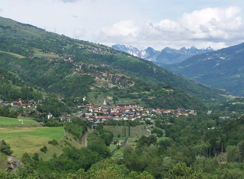 Français : Vue des chefs-lieux des communes française de Aime et de la Côte d'Aime (en surplomb) en Savoie. |
