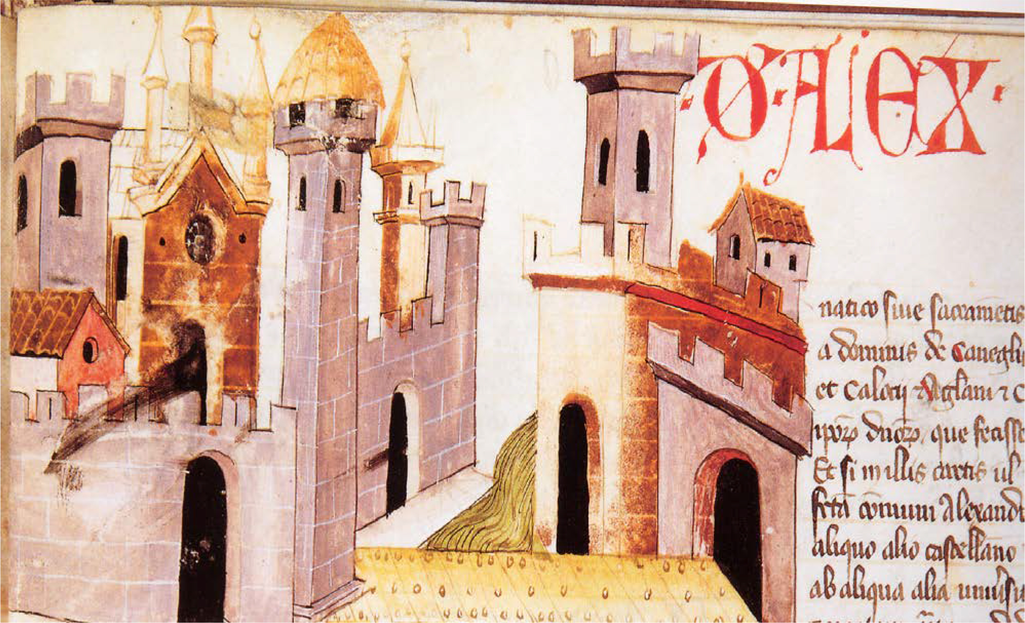 Italiano: Immagine allegorica della città di Alessandria e di Bergoglio con in primo piano il ponte in legno sul fiume Tanaro. Sulla sinistra è riconoscibile la facciata dell’antica cattedrale di Alessandria, demolita da Napoleone nel 1803. Miniatura anonima del Codex Astensis qui Malabayla communiter nuncupatur, XI-XII secolo |