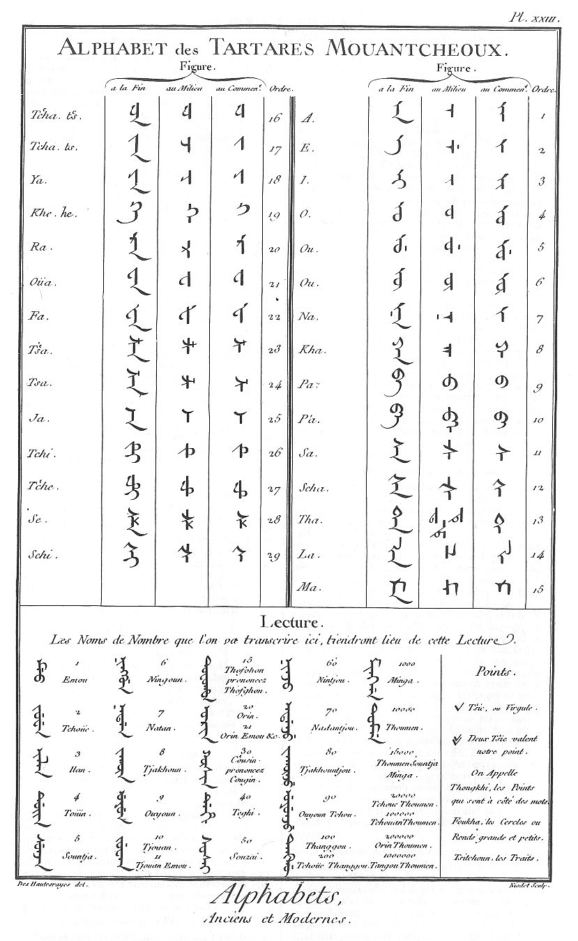 | Description | "Alphabet des Tartares Mouantcheoux". Manchu alphabet. Plate designed by French orientalist Michel-Ange-André Le Roux Deshauterayes (1724-1795). |