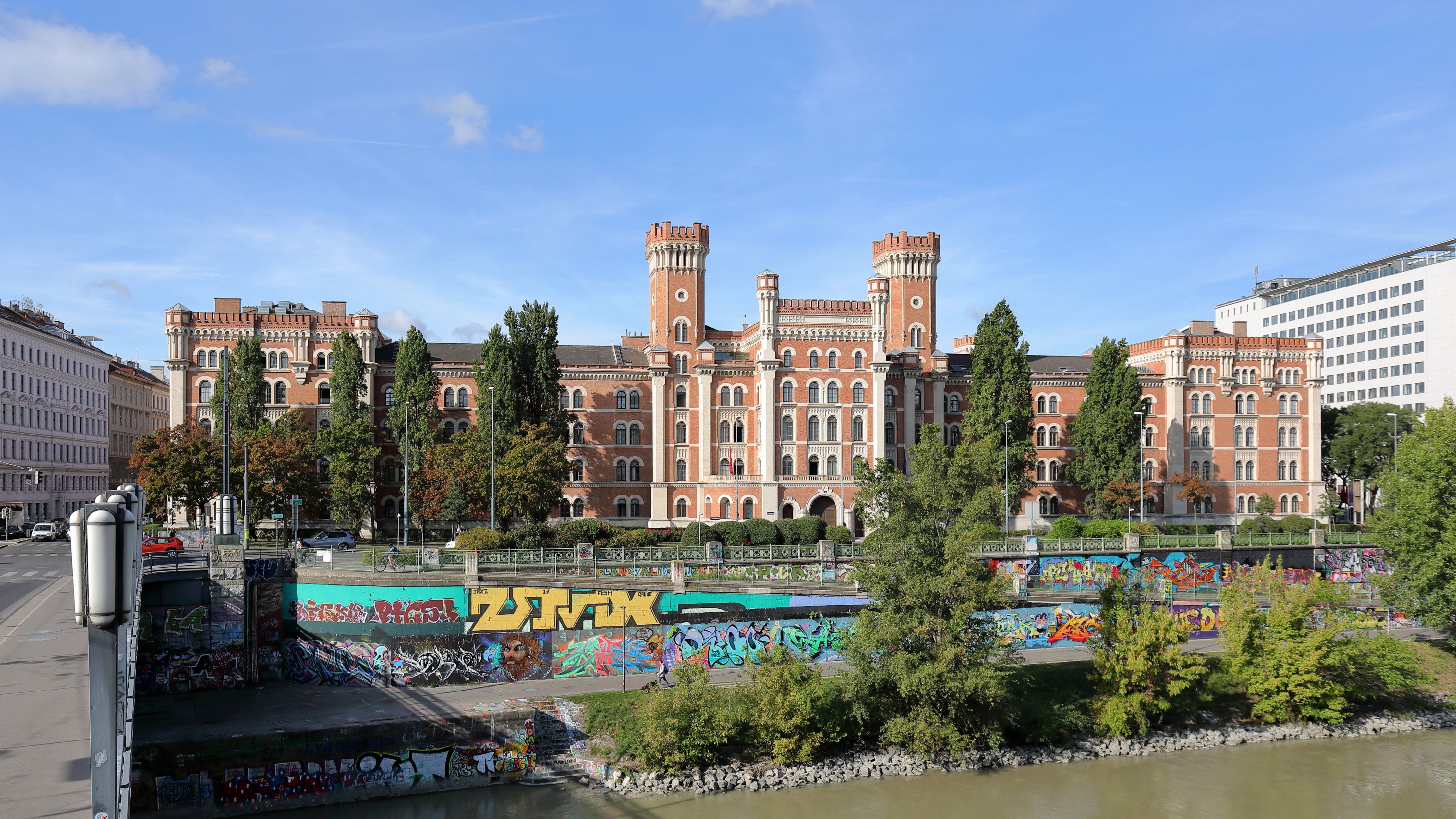 Deutsch: Ostansicht der Rossauer-Kaserne im 9. Wiener Gemeindebezirk Alsergrund. Das Gebäude im Windsor-Stil (veralteter Nachläufer des romantischen Historismus) wurde ab 1865 nach Plänen des Obersten des Geniestabs Karl Pilhal und des Majors Karl Markl errichtet und am 17. August 1870 als Kronprinz-Rudolph-Kaserne der Benützung übergeben. Als „Defensivkaserne" hat sie einen festungsartigen Charakter. Errichtet wurde sie auf einem 43.293 Quadratmeter großen Grundstück mit einer Länge von 270 Meter und einer Breite von 140 Meter. An der Außenfront gibt es rund 1.300 Fenster. |