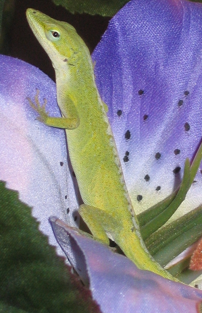 English: A Close-up of a Female Green (Carolina) Anole on a Lily photographed by © Crystal Pare August of 2007 (DragonTU84). |