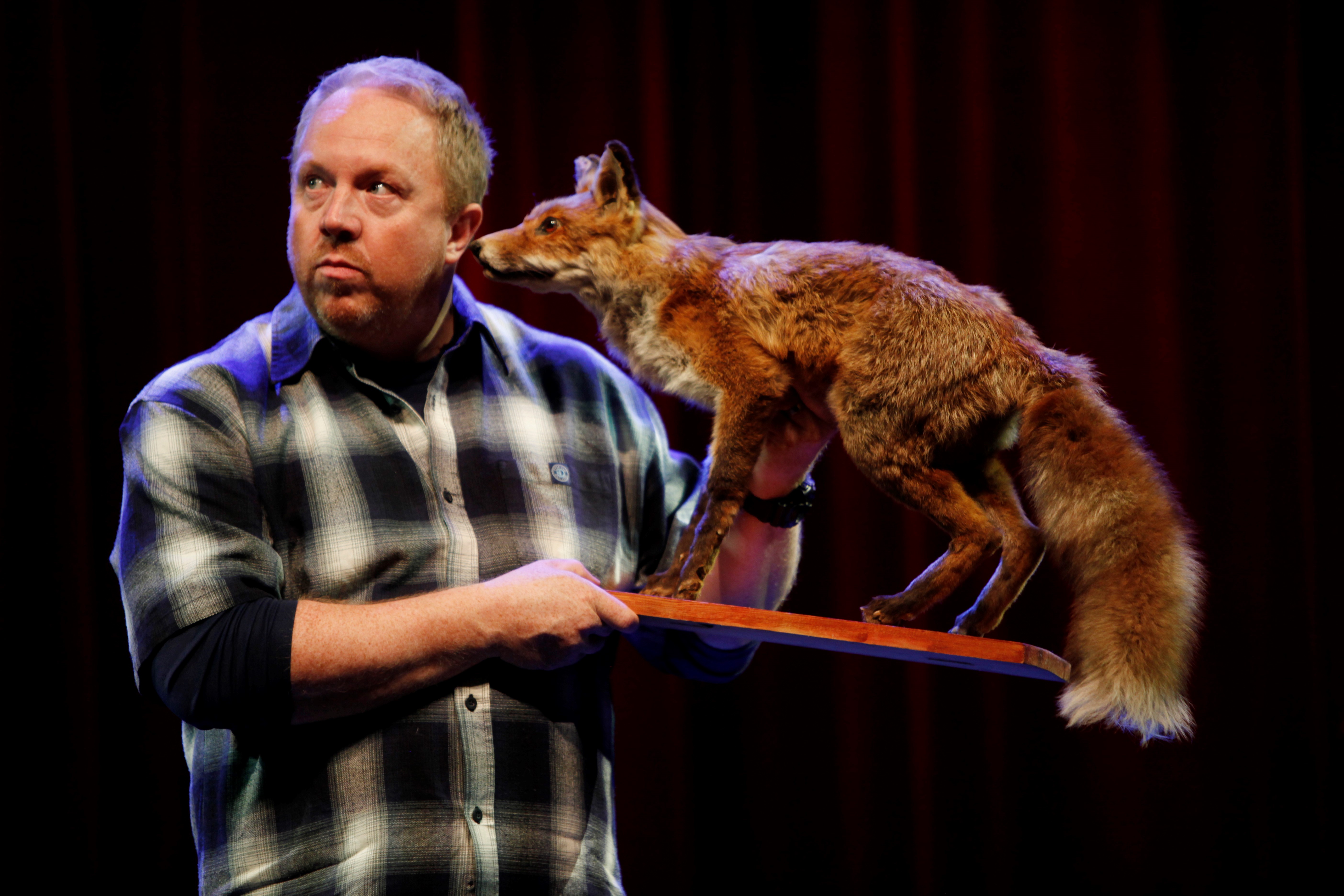 Svenska: Komikern Anders Jansson på scenen med en uppstoppad räv. |