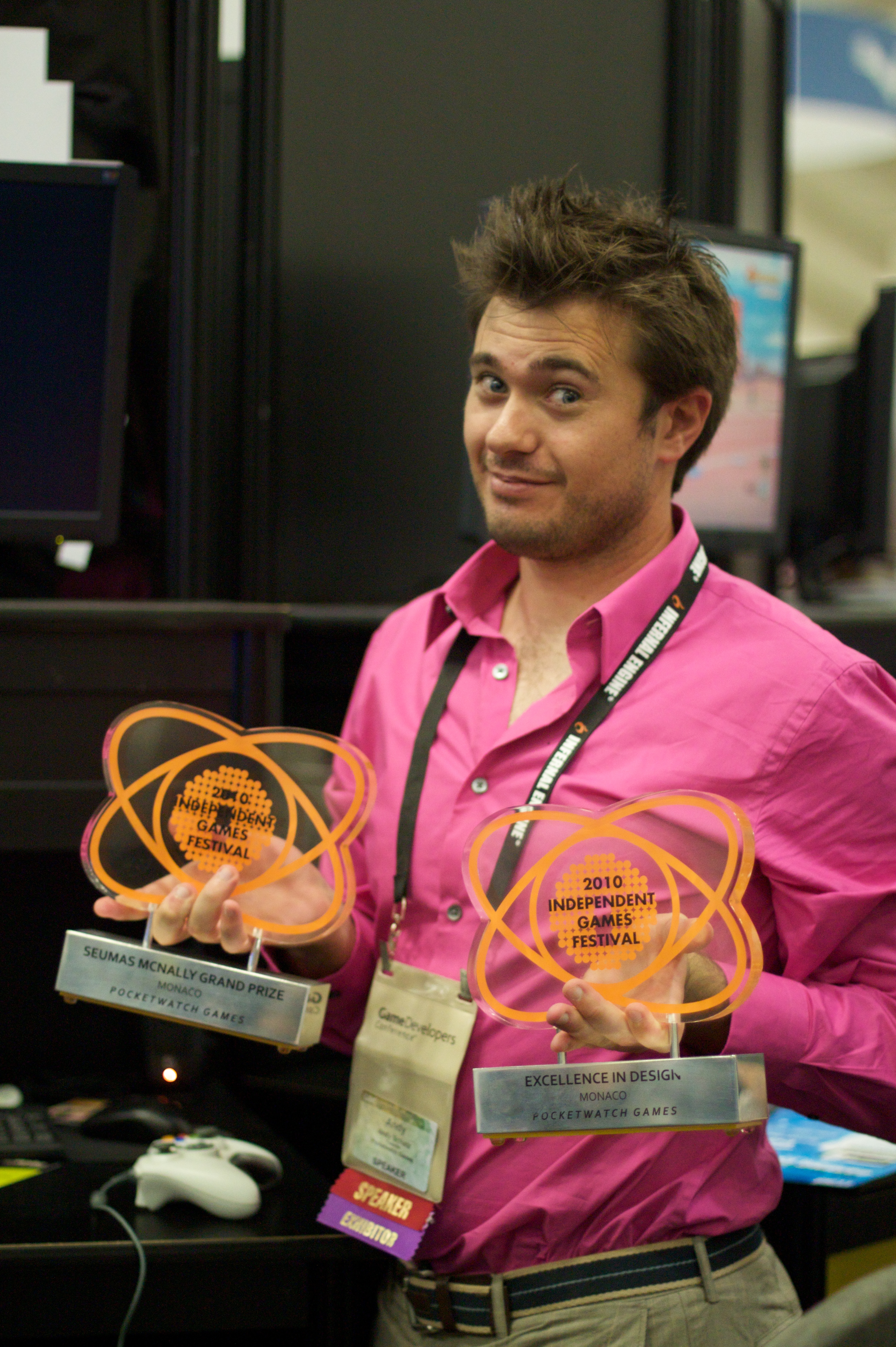 English: Andy Schatz, after winning two awards at the Independent Games Festival in 2010. |