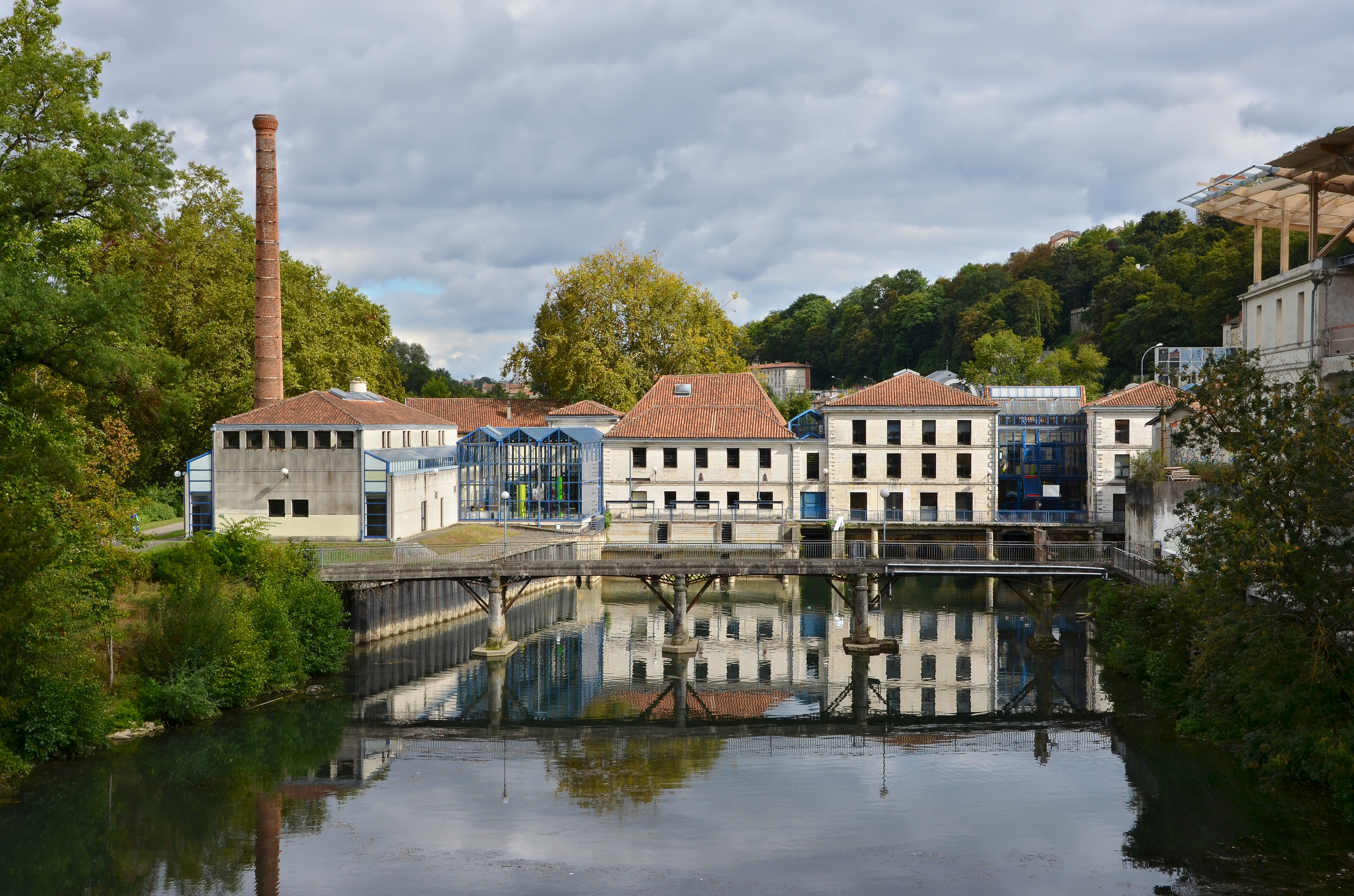 Français : Ancienne papeterie de Saint-Cybard-le-Nil et sa cheminée classée MH (fin du XIXe siècle), aujourd'hui Musée du papier. Angoulême, Charente, France.