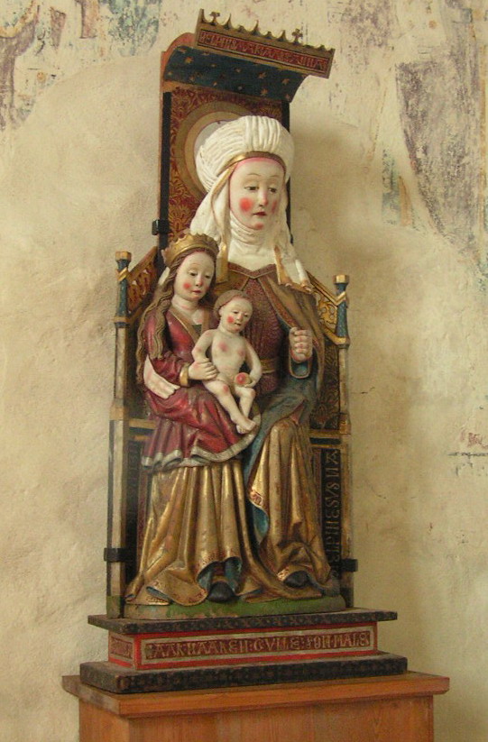 Sankta Anna med Maria och Kristusbarnet, skulptur i Enångers kyrka (The Virgin and Child with St. Anne) Träskulptur av furu i Enångers gamla kyrka. Signerad av Haaken Gulleson och daterad till 1520. Motivet "Anna själv tredje" är vanligt för den tiden. Texten vid foten: "IAAK HAAKEN GULLESON MALER MVCXX" |