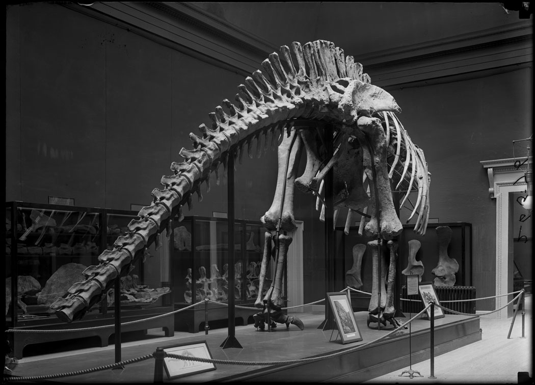English: Apatosaurus excelsus skeleton construction progress. Hall 35, Reptiles. On display with framed photographs, probably of expedition. Field Columbian Museum. 1908.