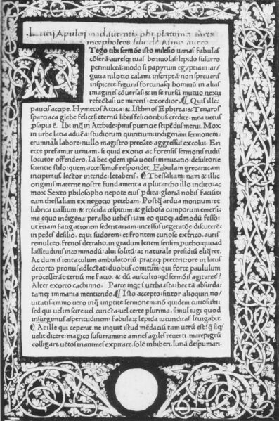 Deutsch: San Marino (California), Huntington Library. Exemplar der editio princeps der Metamorphosen des Apuleius mit den Stellen 1.1 (1,1) bis 1.3 (3,15). Geringfügige Emendationen in margine, die beim Beschnitt des Buches teilweise verloren gegangen sind. |