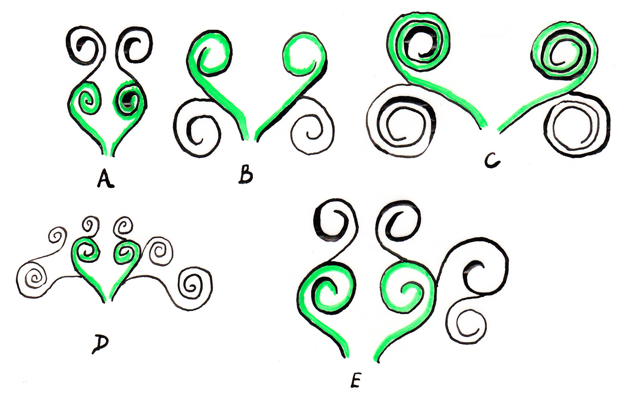 English: Examples of the basic form of the European arabesque, taken from existing monuments. Drawings based on illustrations in Talbot-Rice, Byzantine Art, Penguin Books, 1968, plates 109-114. Note the common core element of the heart shaped confronted volutes & stem, highlighted in green. Key: