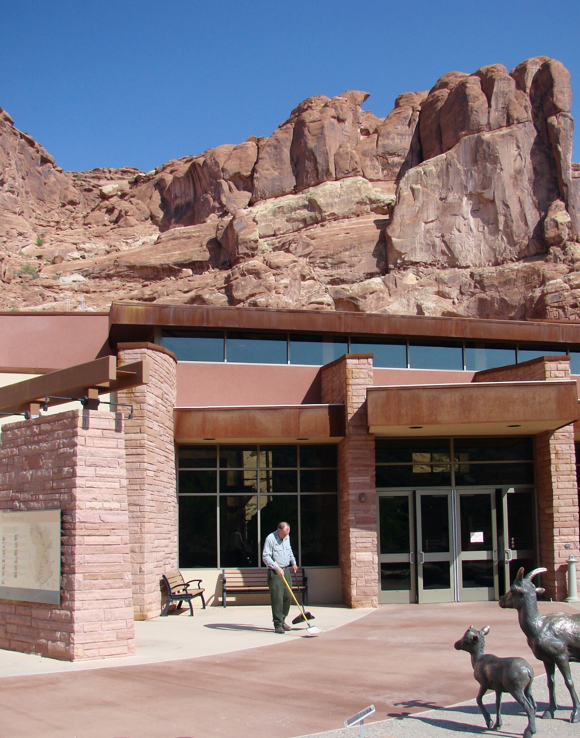 English: (1 in a multiple picture set) At the Park Visitors' Center we got our first surprise. I had imagined that the arches were on the desert floor, but they are about 600 feet above the pass that brings you into the park. The angles ledges above the building are the route of the highway leading up to the arches. |