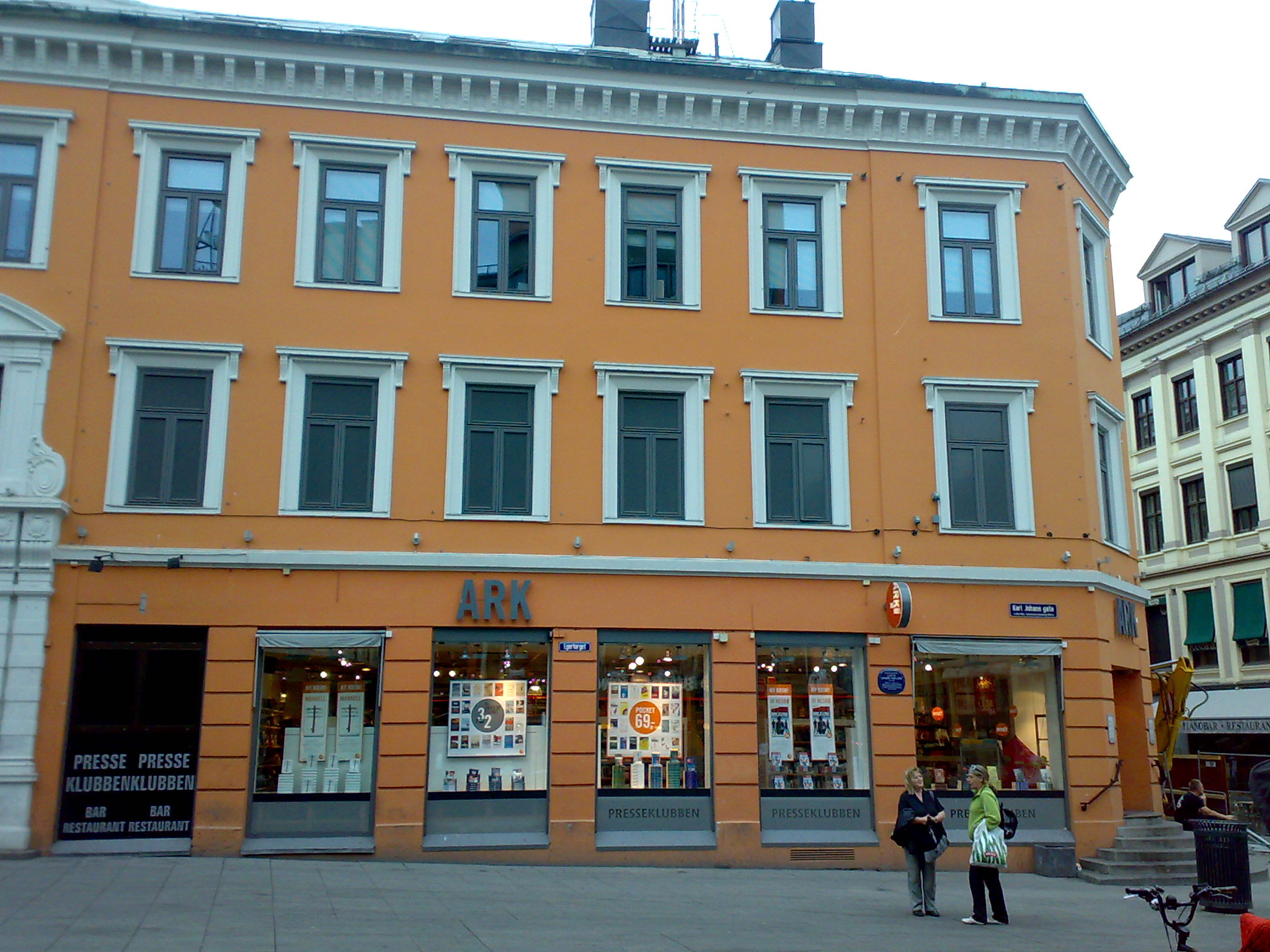 English: Ark bookstore, Oslo. style="background: #ffdddd" class="table-no" | Bokhandelen Ark i Oslo. Øvre Slottsgate 23, på hjørnet med Karl Johans gate. قالب:Monument Norge |