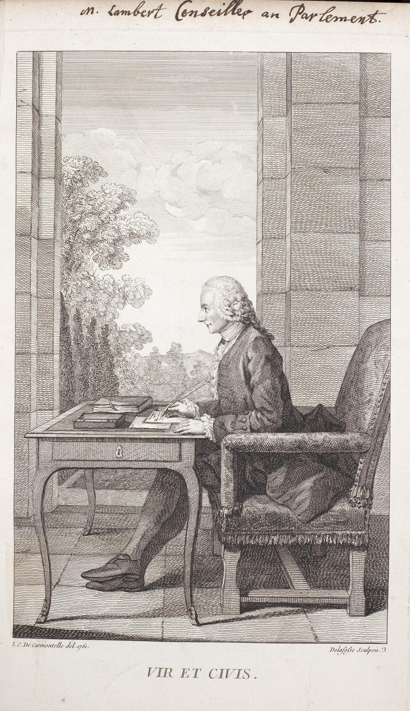 Grafik aus dem Klebeband Nr. 14 der Fürstlich Waldeckschen Hofbibliothek Arolsen Motiv: (handschriftlich:) "m. Lambert Conseiller au Parlement" (= Claude Guillaume Lambert ?) "Vir et Civis" |