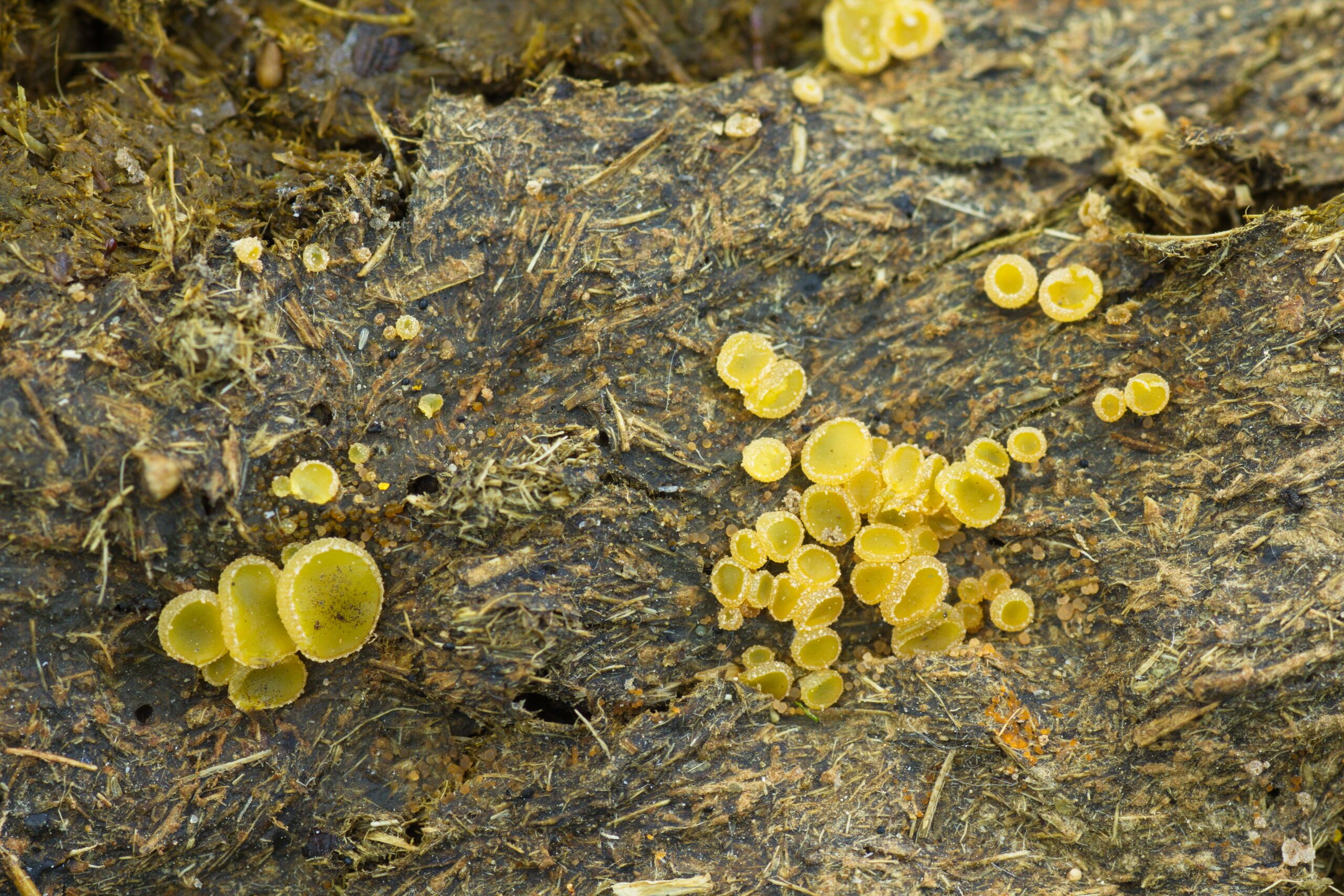 English: Fruit bodies of an unidentified Ascobolus species growing on cow dung. Photographed near Staryi Iskitim, Iskitim district, Novosibirsk region, Russia. |