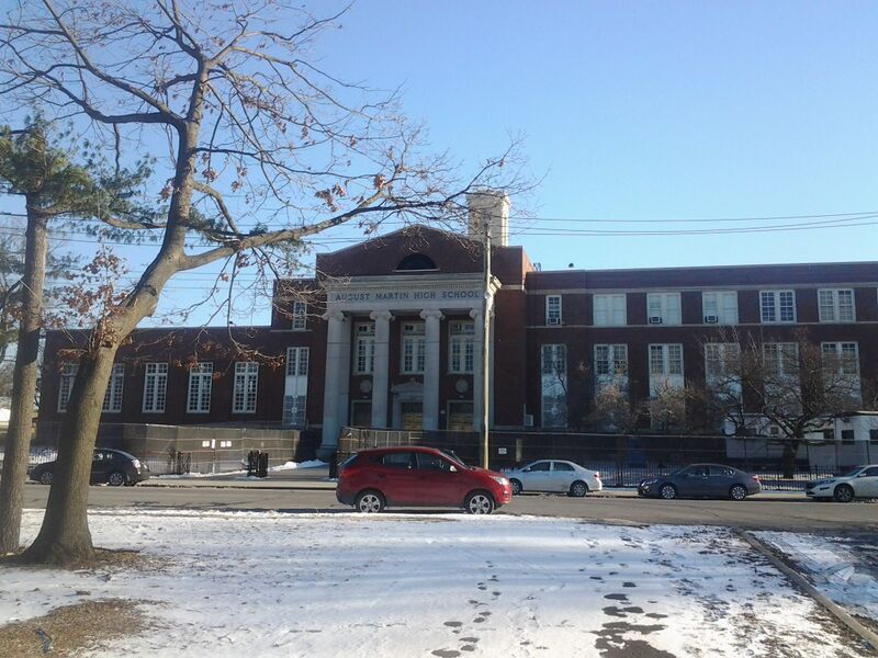 English: August Martin High School in South Jamaica, Queens, New York City. Building opened in 1942, when it was Woodrow Wilson High School. Present school was named for an African American aviator (1919-1968). Located at 156-10 Baisley Boulevard, opposite Baisley Pond Park. |