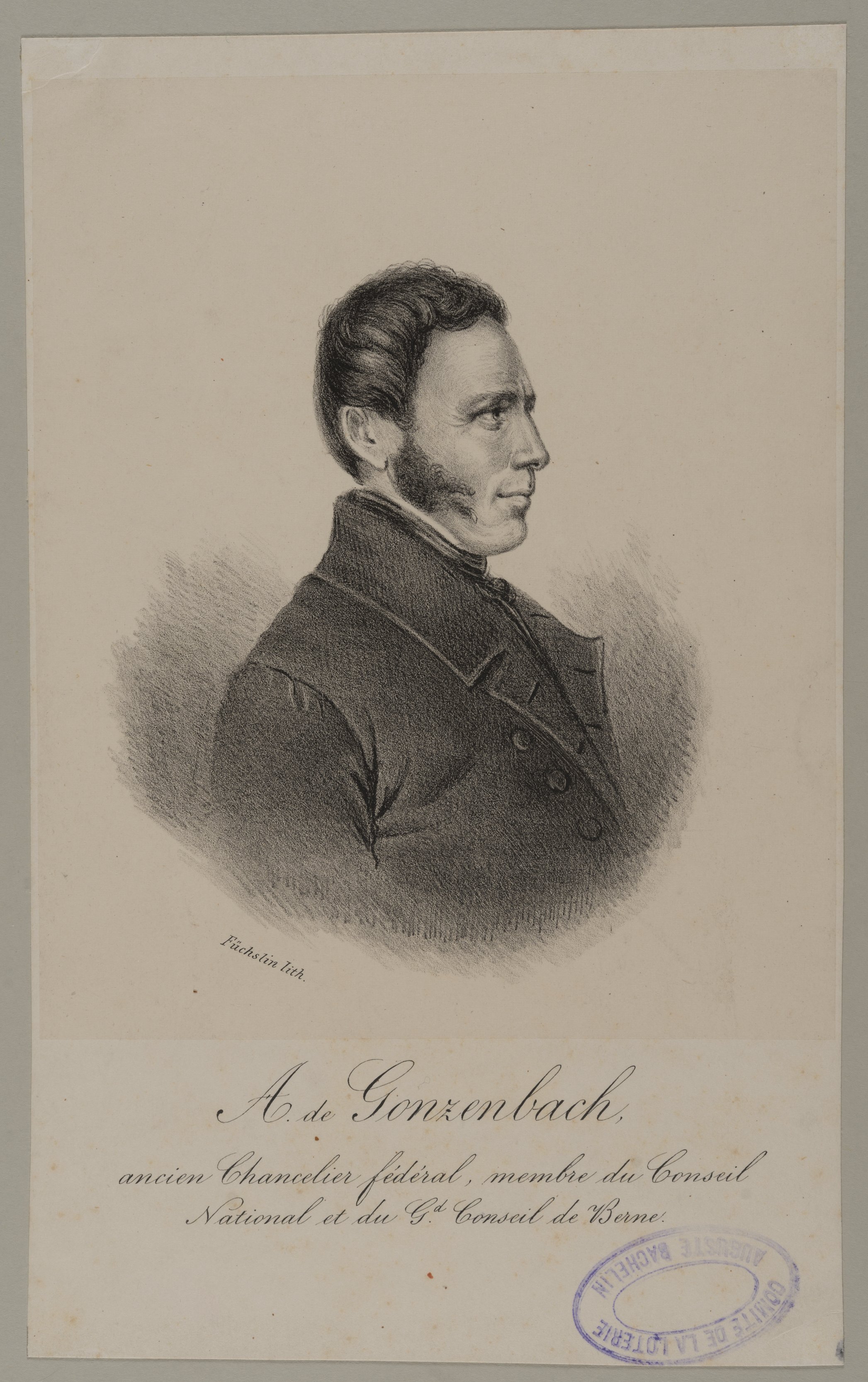Deutsch: Porträt August von Gonzenbach (1808-1887), eidgenössischer Staatsschreiber, Nationalrat, Bern. Herstellung: Lithograf Johann Friedrich Füchslin (1801 - 1857), Bern; Sammler Stutz (Sammlung) Johann (1849 - 1915), Rüschlikon. 25,3 x 15,5 cm. Lithographie auf Velin. |