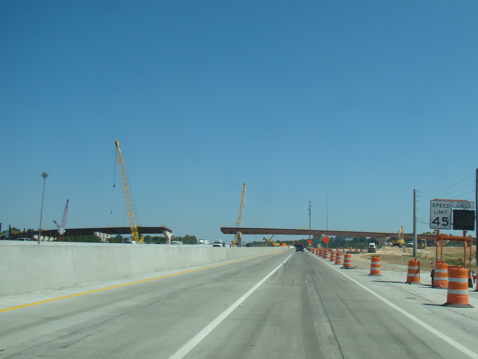 English: Augusta, Georgia, USA. Interstate 20 (Eastbound) at Interstate 520 (I-20 exits 196A-B) interchange, Flyover ramp construction for I-20 westbound to I-520 eastbound. Second flyover ramp from I-520 westbound to I-20 westbound to be built. Other keywords: interstate, roadwork, speed limit sign, radar, bridge, overpass, Bobby Jones Expressway (I-520) NOTE: This version is cropped from the original image at the Flickr address listed. |