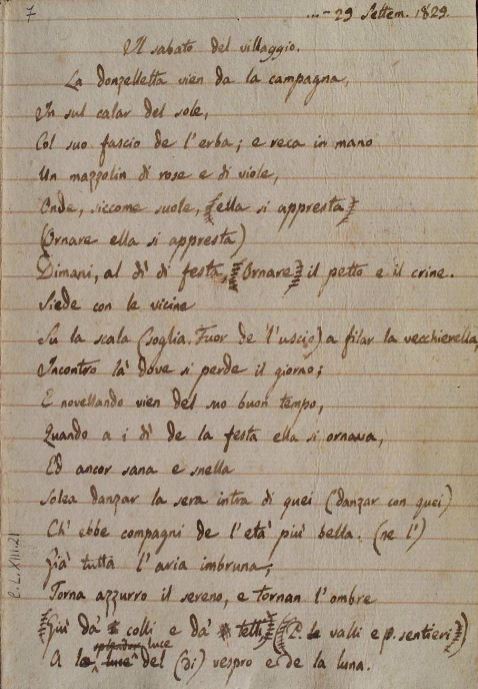 Italiano: Autografo leopardiano del Sabato del Villaggio |