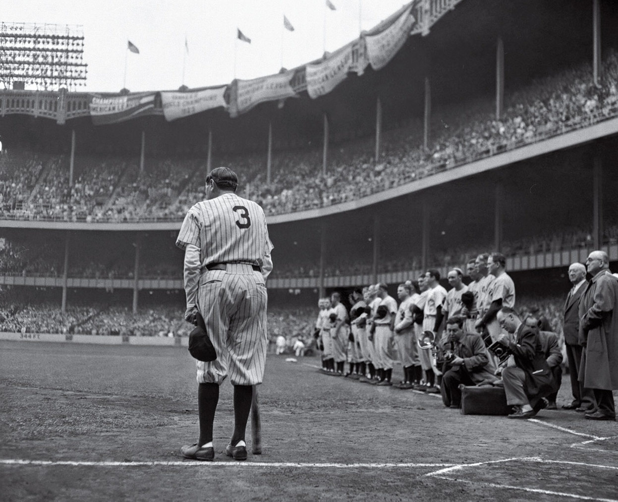 English: "Babe Ruth Bows Out", photograph of Babe Ruth during a ceremony at Yankee Stadium to retire his number. This photograph won the 1949 Pulitzer Prize for Photography.