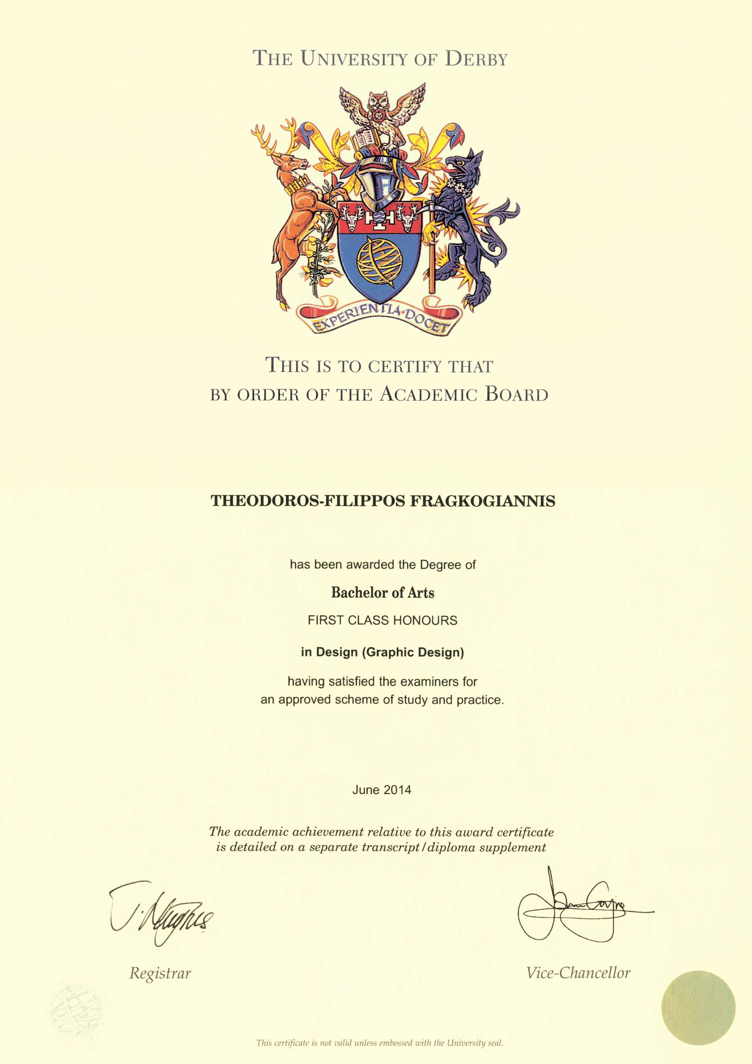 English: Filippos Fragkogiannis’ Bachelor of Arts (Honours) in Design (Graphic Design) degree from the University of Derby, United Kingdom. |