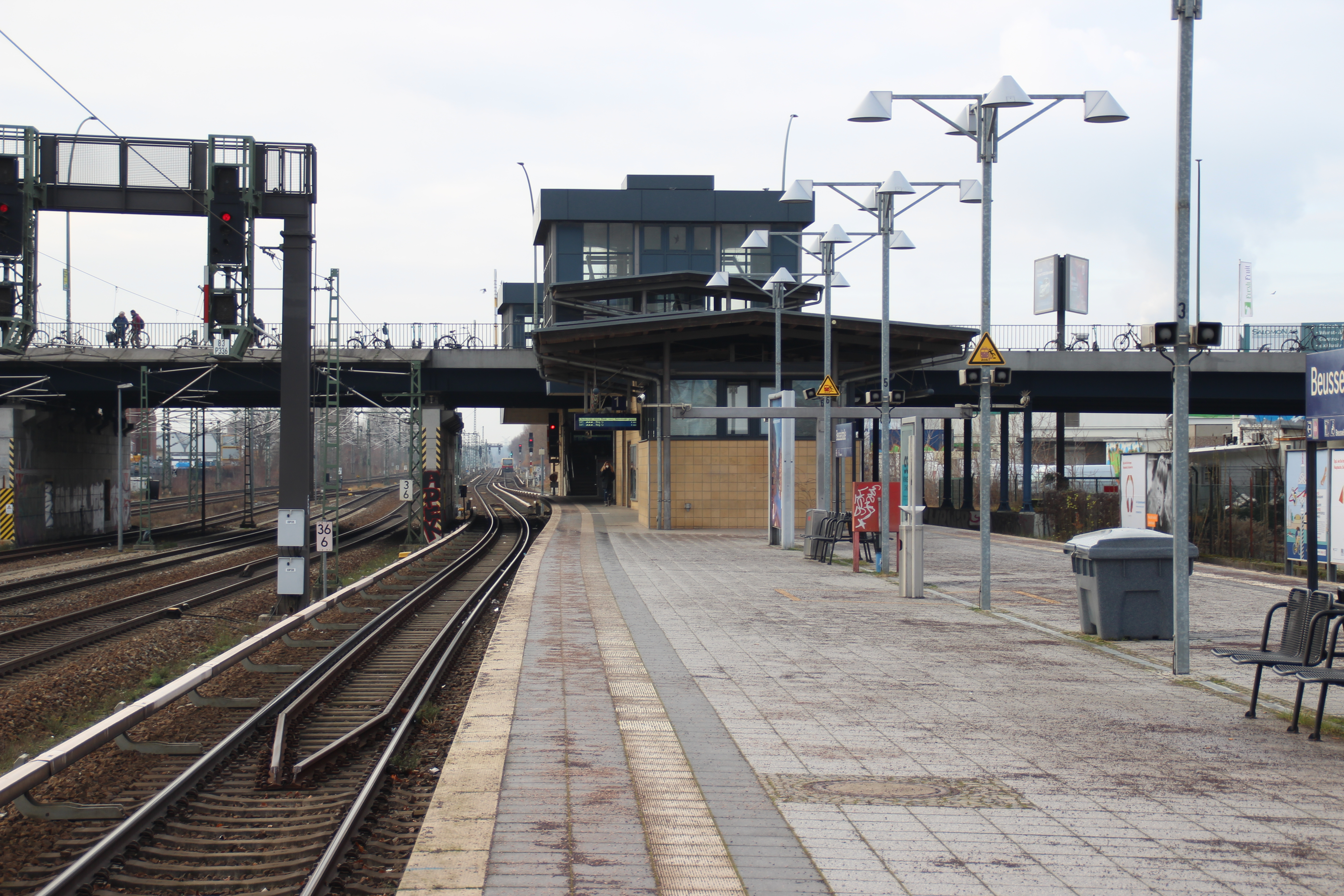 Deutsch: Der S-Bahnhof Beusselstraße in Berlin-Moabit im Bezirk Mitte ist eine Haltestelle der Berliner Ringbahn (Linien S41 & S42). Das Bild zeigt den Bahnsteig in Blickrichtung Westen. Die Beusselstraße überquert die Regionalschienen (links im Bild) und den S-Bahnhof. |