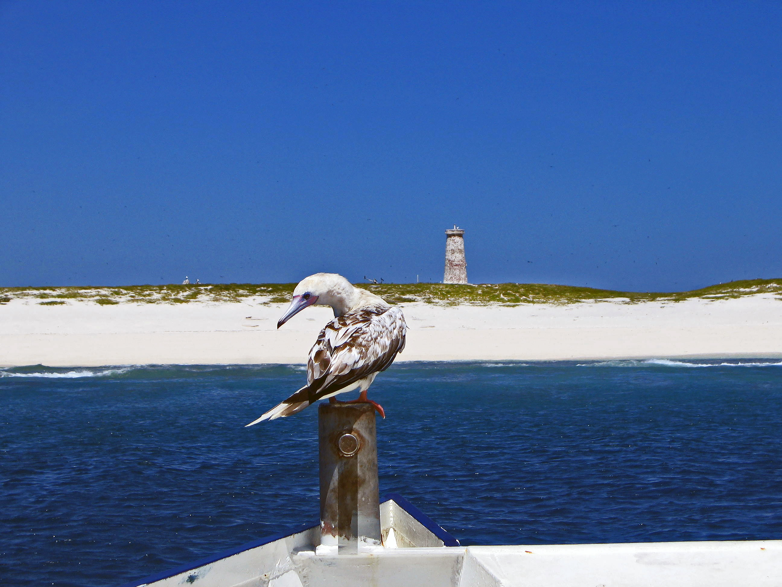 English: Baker Island, coastline with day beacon. A red-footed booby Sula sula in foreground |