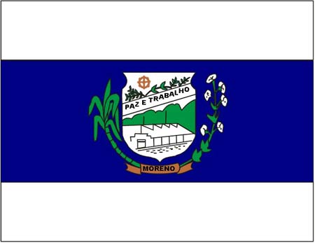 Bandeira do Município de Moreno Pernambuco A constituição da bandeira encerra o seguinte significado: Branco e Azul – cores do baronato do Moreno; Roda de Engenho – símbolo da fonte da cidade, o Engenho Catende; Ramos de eucalipto – símbolo das verdes colinas; Cana-de-açúcar – representando a monocultura do município; Algodão – simbolizando a matéria-prima da fonte econômica do município. Foram idealizados pela Mestra Sevy Rocha a convite do então prefeito do município Raul Alves de Melo. No dia 21 de novembro de 1965, em frente a sede da prefeitura do Moreno, fazia-se pela primeira vez o hasteamento do pavilhão do município, bem como a entoação do seu hino. |