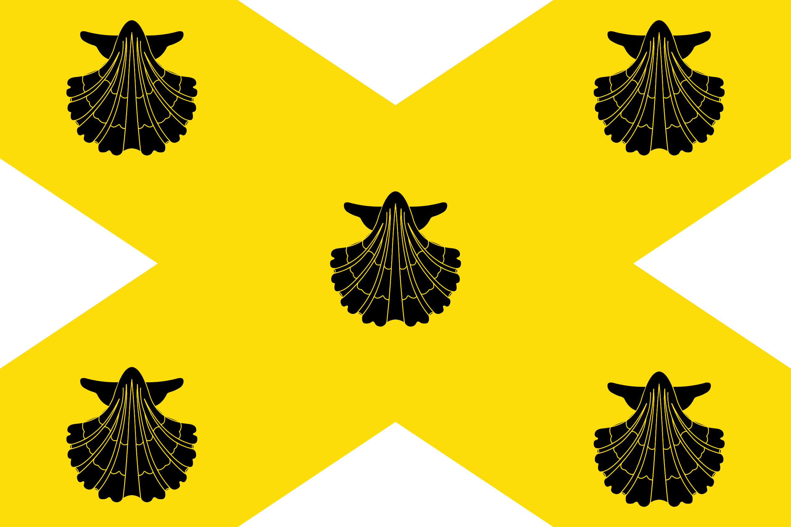 Español: Paño de proporción 2/3, blanco; con un aspa amarilla cargada de cinco veneras negras, una en el centro y cuatro en los extremos.