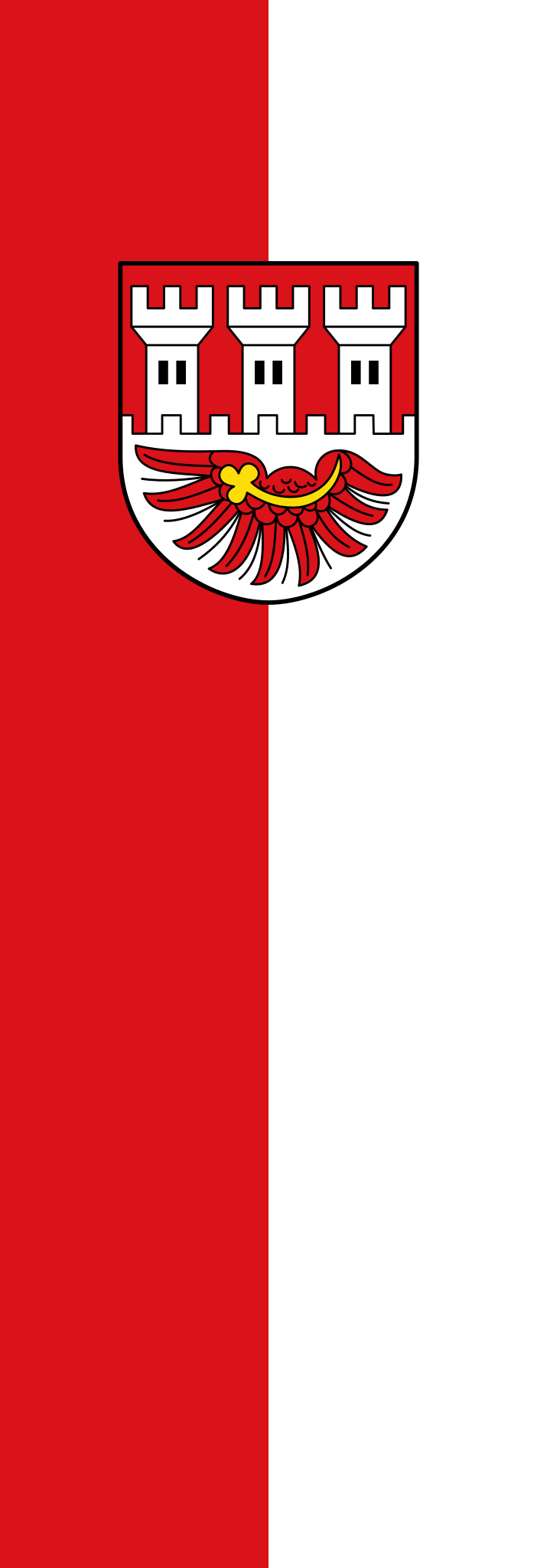 Deutsch: Banner der Stadt Porta Westfalica, Kreis Minden-Lübbecke, Nordrhein-Westfalen, Deutschland Beschreibung des Wappens:„Durch Zinnenschnitt in Rot und Silber (Weiß) geteilt; oben drei silberne (weiße) Zinnentürme, unten ein roter balkenweise gelegter Adlerflügel mit goldenem (gelbem) Kleestengel.“ Beschreibung des Banners:„Das Banner der Stadt ist Rot-Weiß gespalten belegt mit dem Wappen oberhalb der Mitte.“ Français : Drapeau vertical la ville allemande de Porta Westfalica |