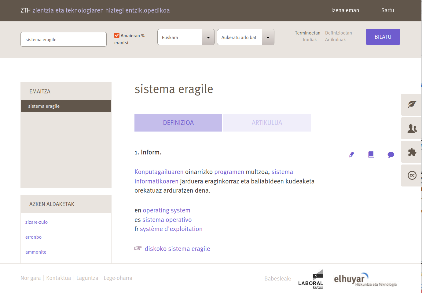 Euskara: Zientzia eta teknologiaren hiztegi entziklopedikoan 'Sistema eragile' kontsultatzen