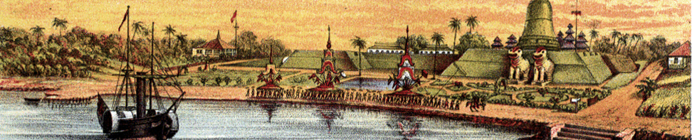 English: Artist rendition of Bassein (now Pathein) shoreline in the late 1800s (Burma). |
