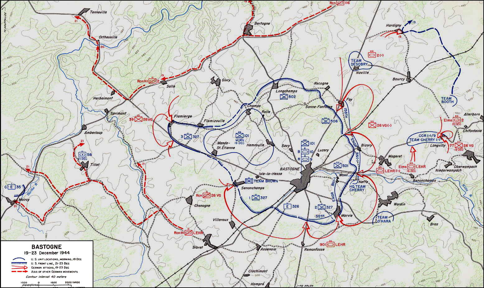 تصغير للنسخة بتاريخ 02:46، 13 أكتوبر 20231٬556 × 927 (1٫19 ميجابايت)Pastakhov (نقاش | مساهمات)Upload https://upload.wikimedia.org/wikipedia/commons/b/b0/Bastogne_Map_December_19-23_1944.jpg