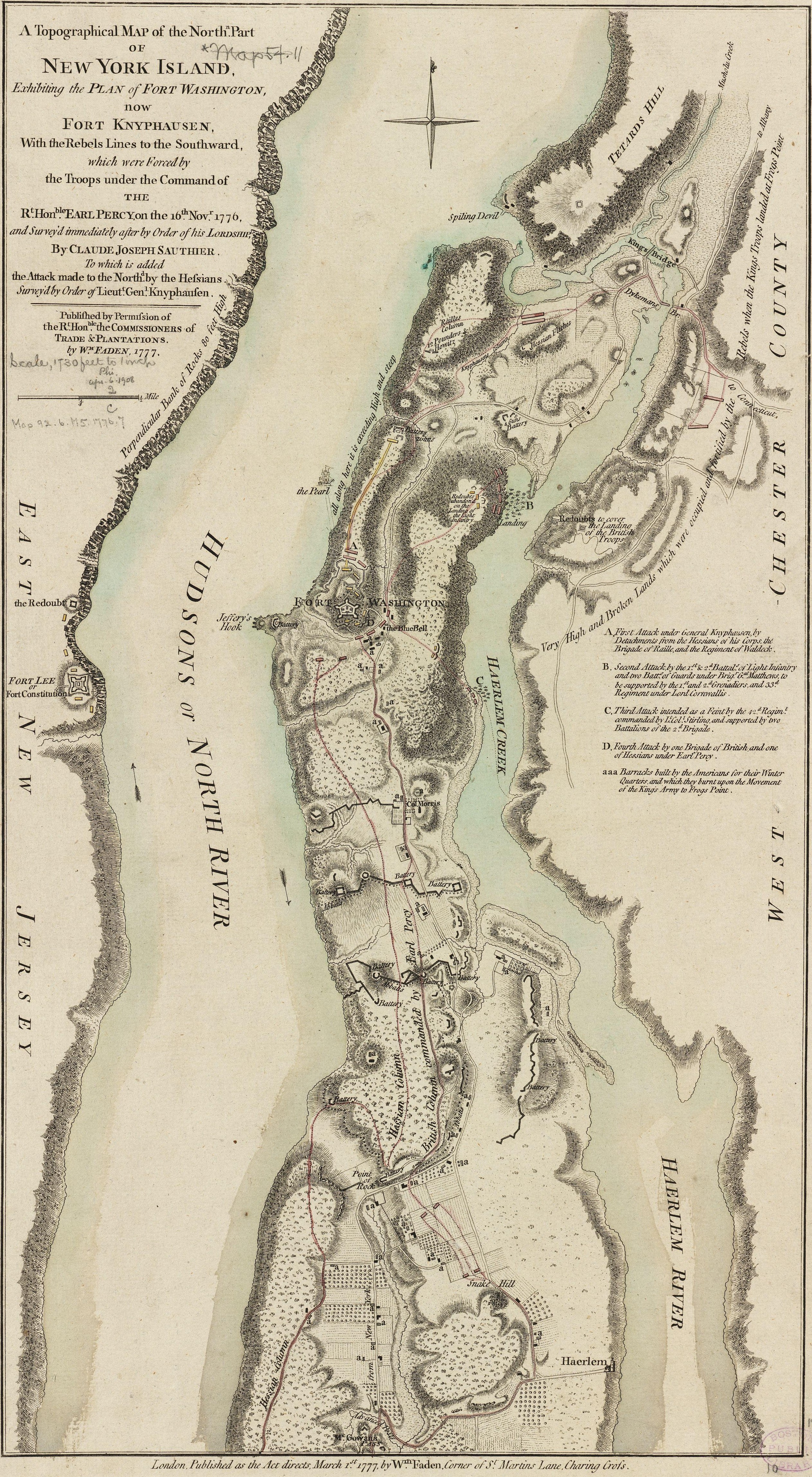 The map's caption reads: A Topographical Map of the Northn. Part of New York Island, Exhibiting the Plan of Fort Washington, now Fort Knyphausen, With the Rebels Lines to the Southward, which were forced by the Troops under the Command of the Rt. Honble. Earl Percy, on the 16th Novr. 1776, and Survey'd immediately after by Order of his Lordship, By Claude Joseph Sauthier. To which is added the Attack made to the Northd. by the Hessians Survey'd by Order of Lieutt. Genl. Knyphausen. Published by Permission of The Rt. Honble. the Commissioners of Trade & Plantations. By Wm. Faden, 1777. |