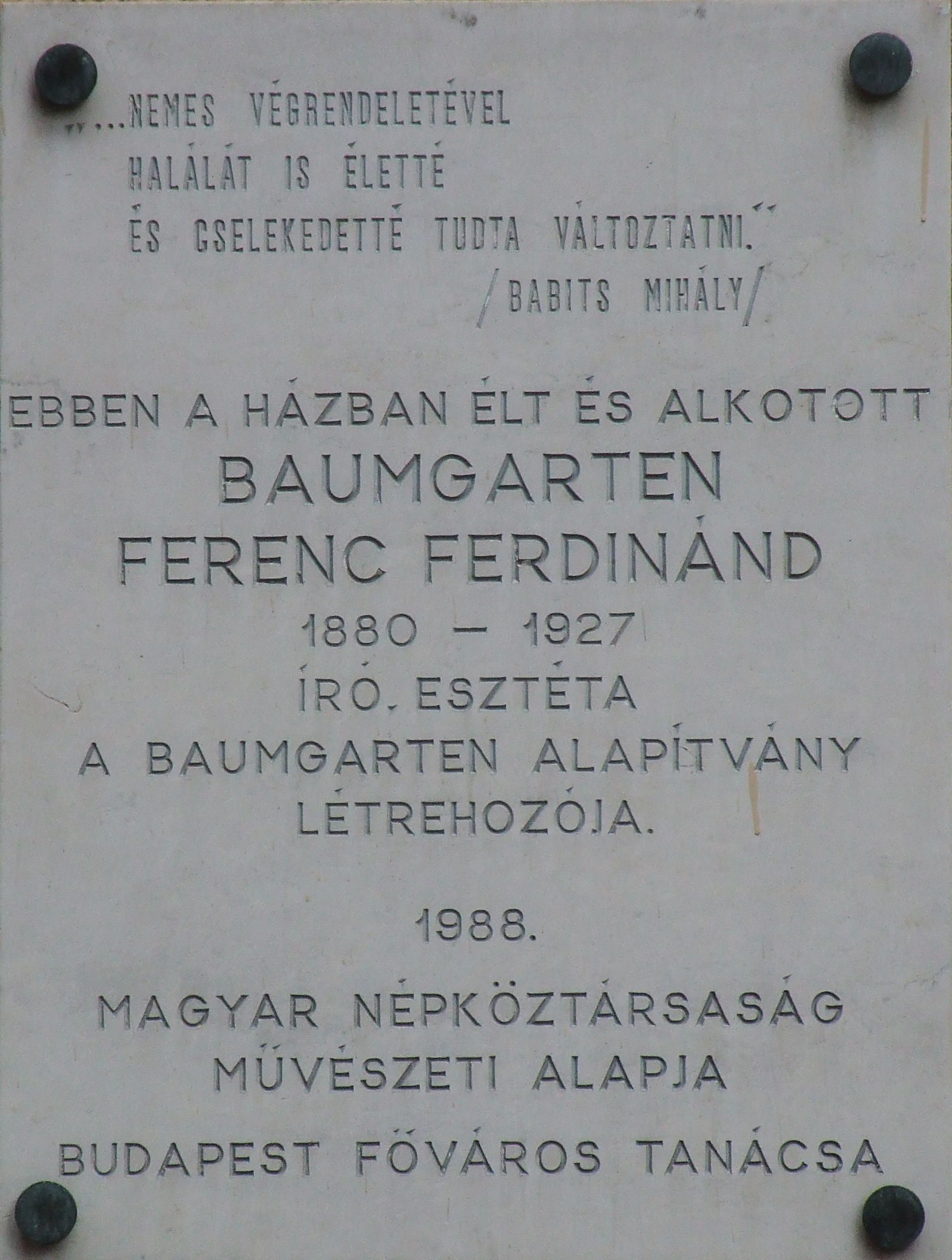 (مجرية) English: Commemorative plaque of Ferdinánd Baumgarten Ferenc, Budapest District V, Sas Street No 1 |