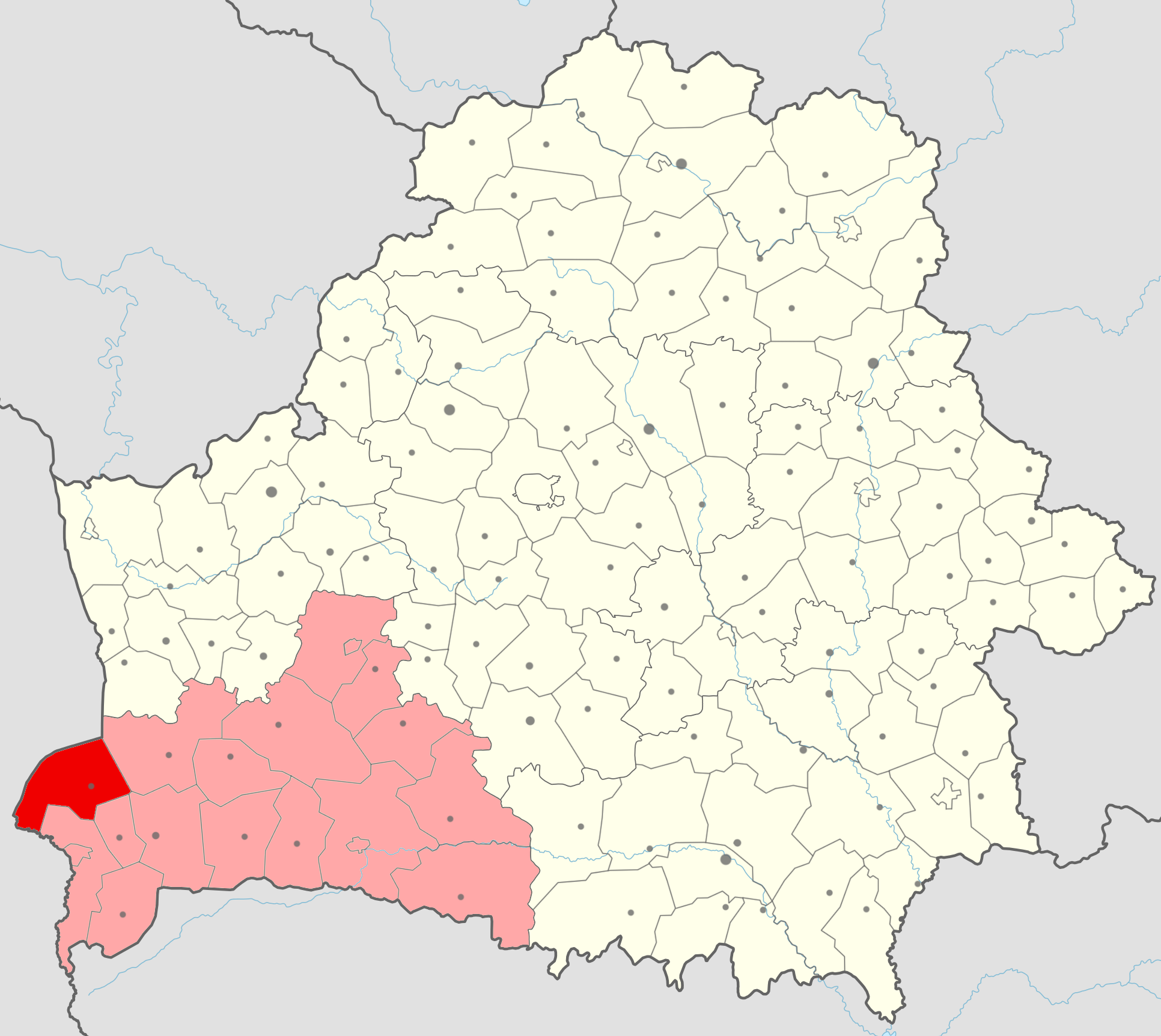 قالب:Country data Карта Каменецкого района (красным) в Брестской области (розовый) на административной карте Беларуси. English: Location of Kamianiecki rajon (red) in Bresckaja voblasć (light red) in Belarus. |