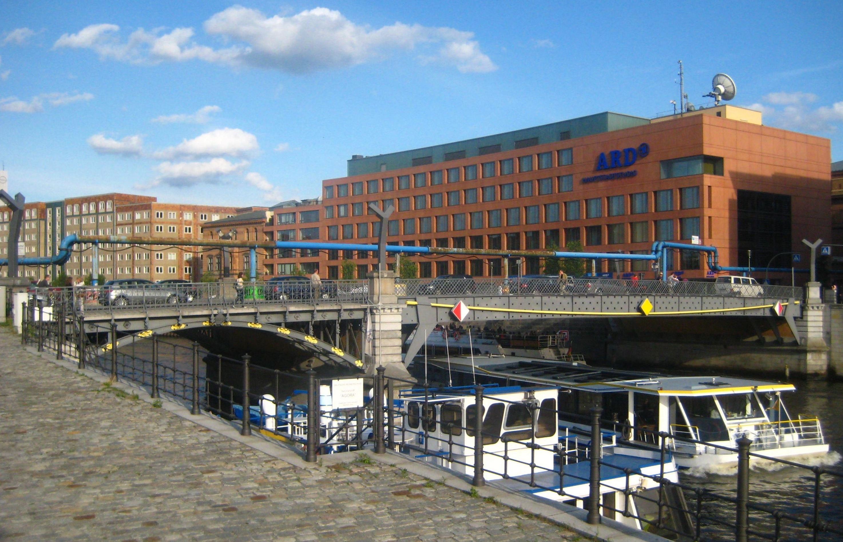 Deutsch: Die Marschallbrücke über die Spree in Berlin-Mitte, erbaut 1881-1882 nach einem Entwurf von Albert Gottheiner. Die ursprünglich dreibogige Eisenfachwerkbrücke mit zwei Flusspfeilern aus Granit wurde gegen Ende des Zweiten Weltkriegs durch Sprengung zerstört und nach dem Krieg vereinfacht wiederhergestellt. Bei einer Renovierung in den Jahren 1997-1998 wurde die Brücke nach Plänen von Gerhard Pichler und Benedict Tonon in eine zweibogige Brücke umgewandelt. Der südliche Flusspfeiler wurde abgerissen, der erhaltene mittlere Bogenträger in den neu errichteten Anhalter Steg über den Landwehrkanal in Berlin-Kreuzberg integriert. Die Marschallbrücke ist trotz dieser Umbauten als Baudenkmal ausgewiesen. Im Hintergrund sieht man das ARD-Hauptstadtstudio, erbaut 1998 nach einem Entwurf der Architekten Ortner & Ortner. |