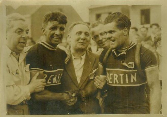 Français : Albert Ramon et Valère Olivier à l'issue d'une course cycliste sous les couleurs de l'équipe Bertin-Wolber (1950-1951). |