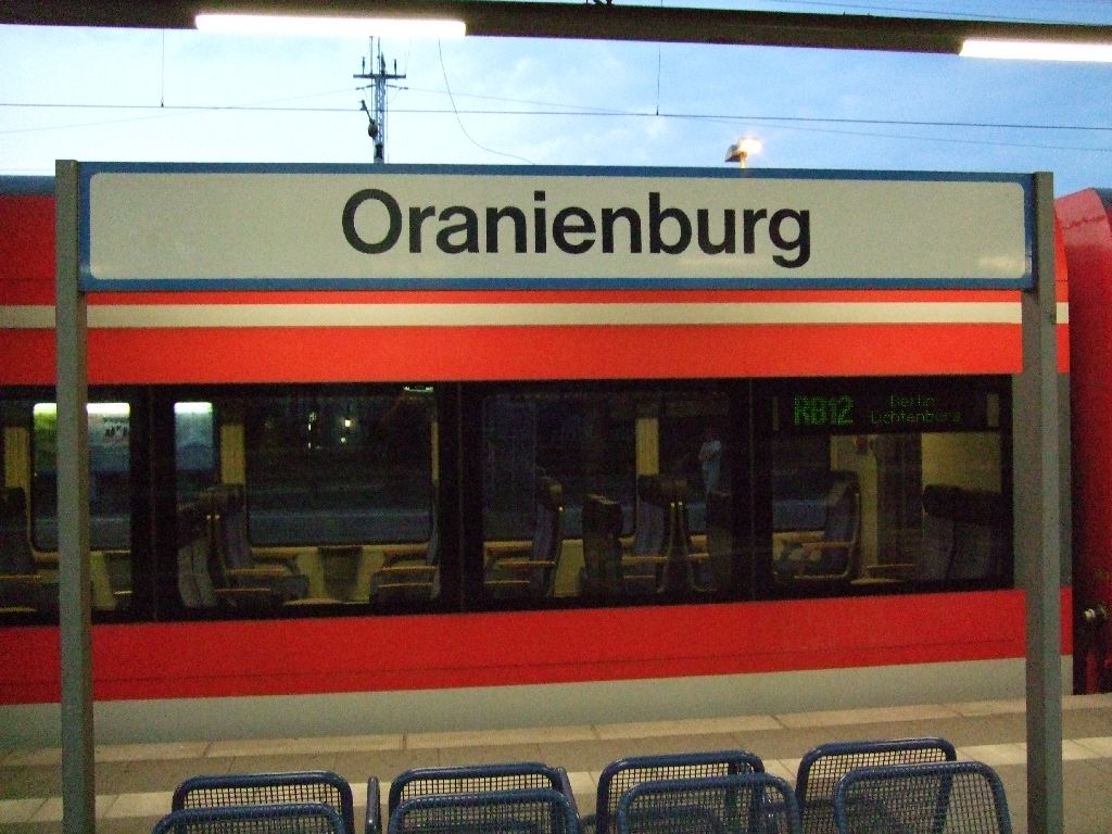 English: Bahnhof Oranienburg station sign and RegionalBahn train